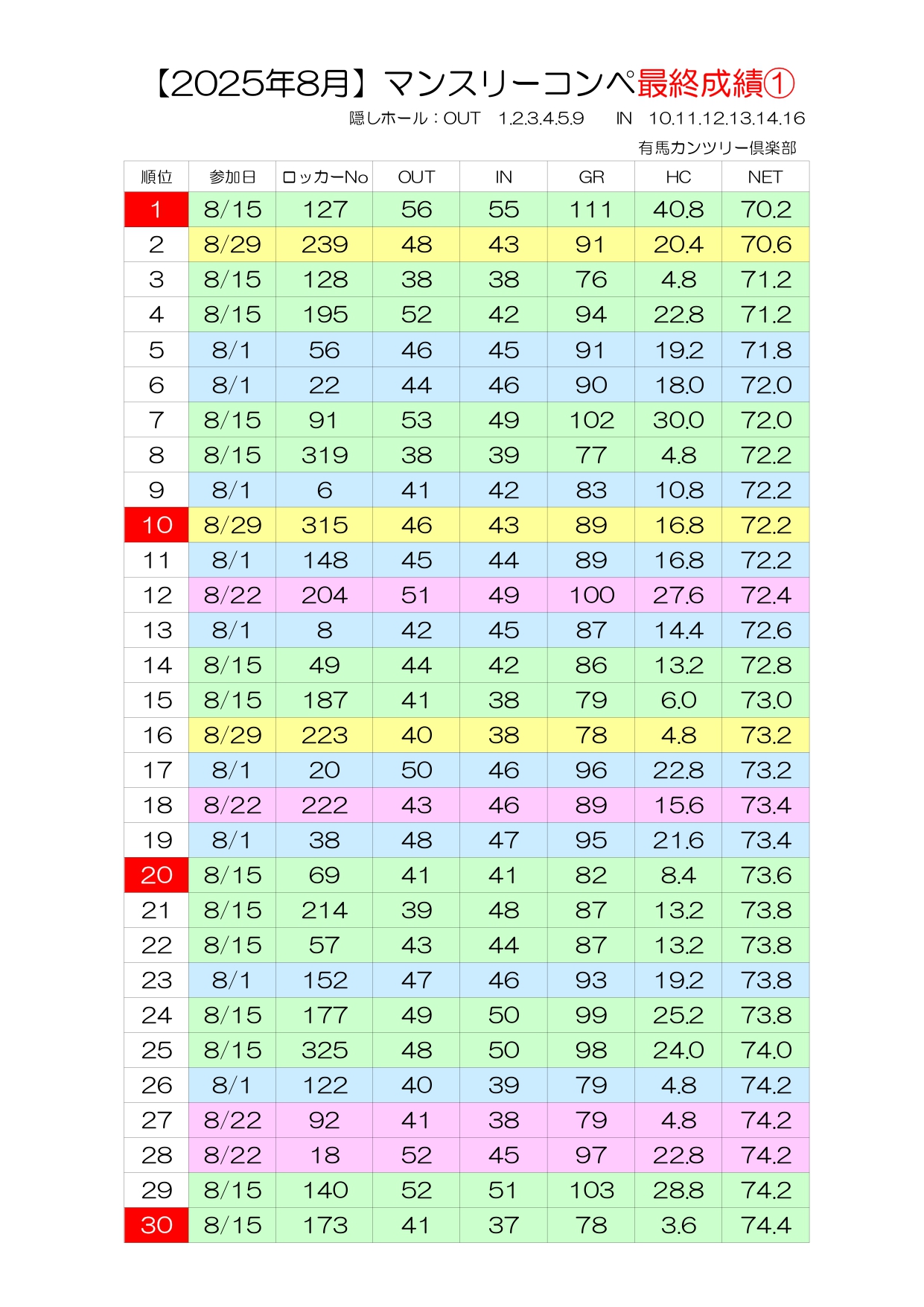※成績は参加日とロッカー番号で記載しております。