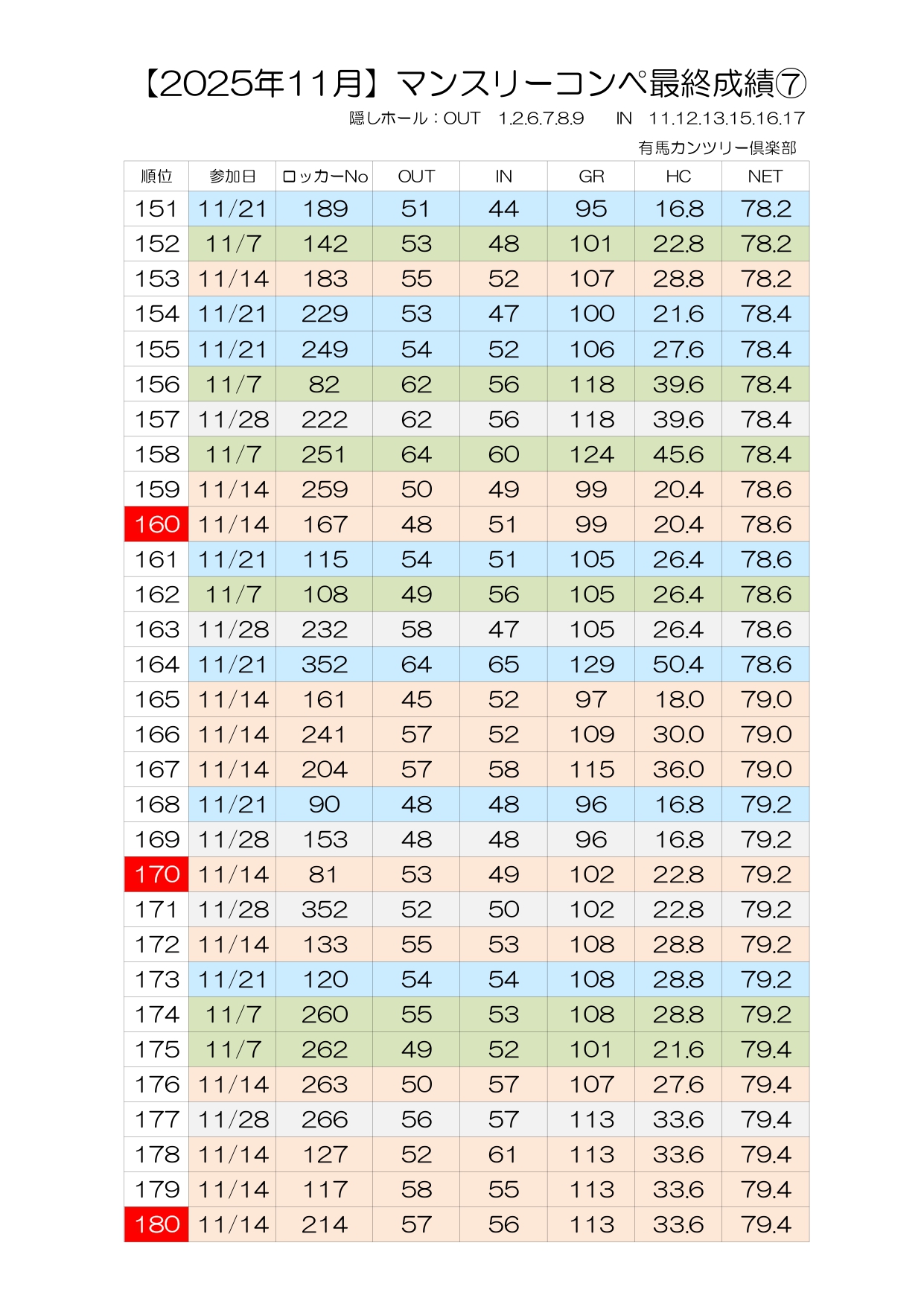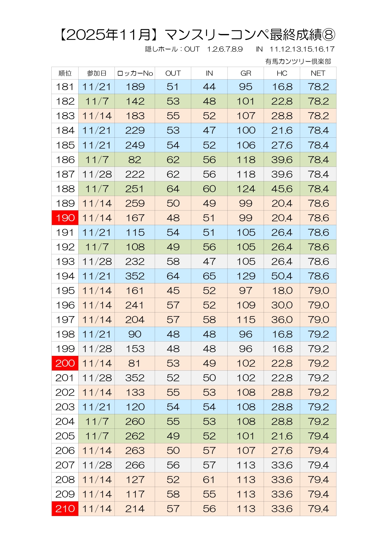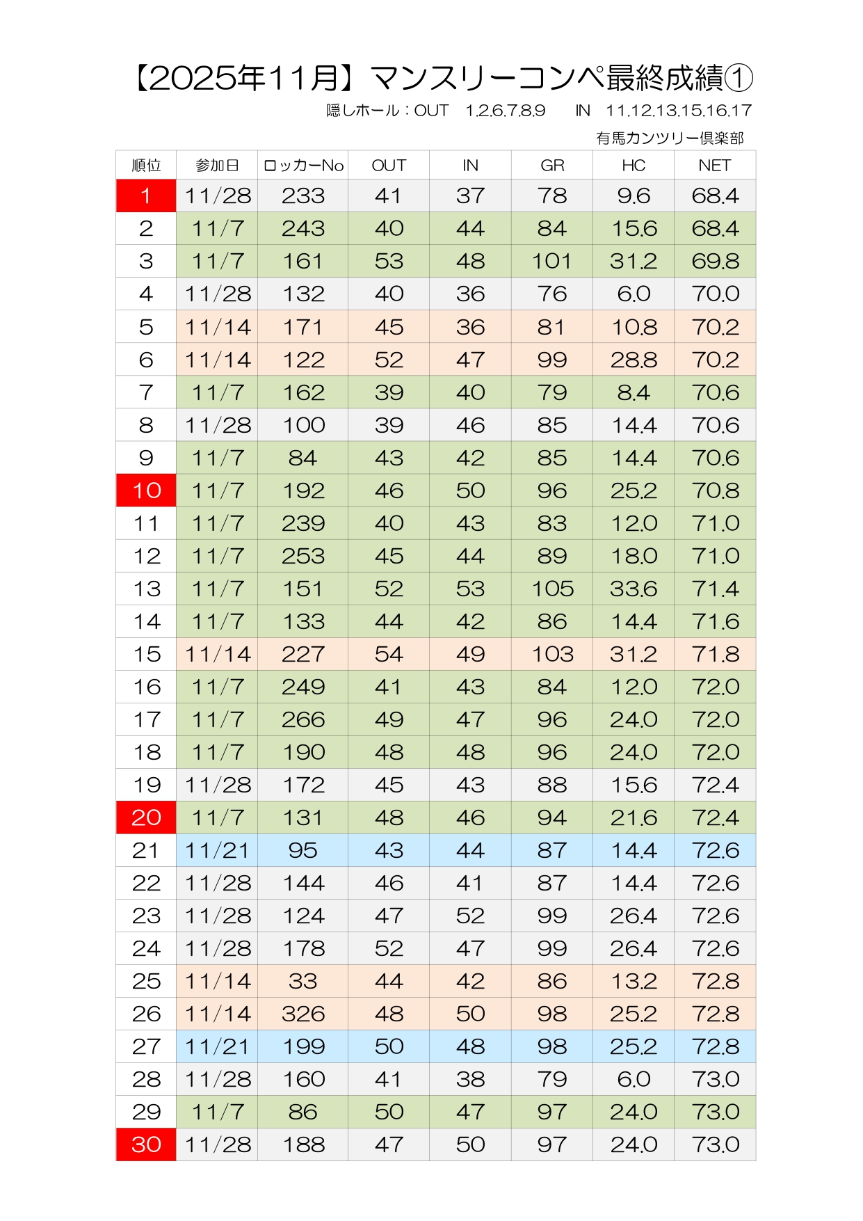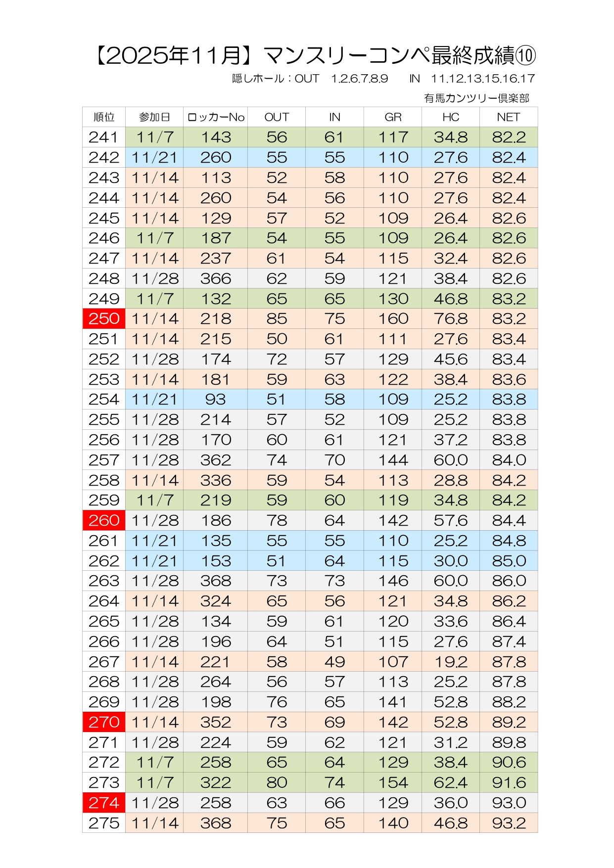 それでは11月度マンスリーコンペ最終成績(275名)を発表いたします。