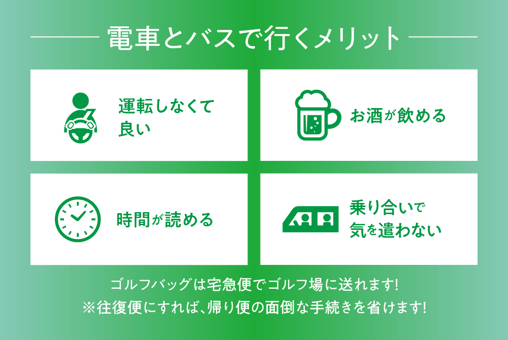 有馬カンツリー倶楽部は周辺のアクセスが良く、ゴルフ場としては数少ない公共交通機関だけでも行くことができるゴルフ場です。プレーはもちろん、練習だけのご利用など、どの時間帯でもお越しいただけ易くなっております。また、車を使わず、電車とバスで行くことには以下のようなメリットもあります。